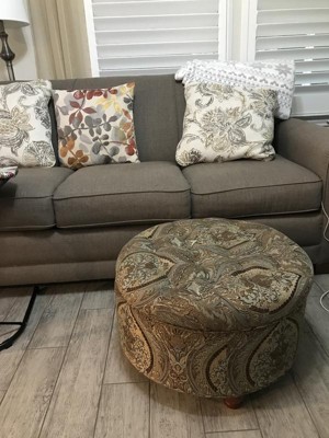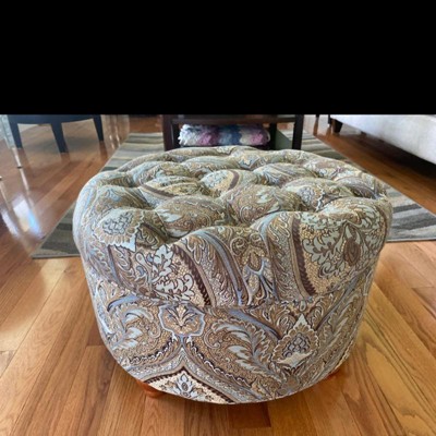 This round storage ottoman offers timeless style in a modern brown and blue paisley pattern. With wood legs in a light cherry finish and button tufting on top, this plush tufted ottoman creates impact in any space. Use it in the living room or family room to contain controllers, remotes or toys or place it in a bedroom to hide pillows or throws. This elegant multi-tasking storage ottoman can also provide extra seating or serve as an ottoman coffee table. The lift-off lid enables quick access to storage within. Easy to assemble and maintain. Please note that fabric and wood colors may appear slightly different due to variations in lighting or screen settings.