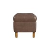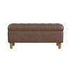 This brown faux leather tufted storage bench provides a variety of home décor options. Use it as a coffee table ottoman in a living room to serve guests. Position it in a family room to relax feet on after a long day. Place it as an end of bed bench to hold pillows and blankets. With wood round shaped legs in a warm honey oak finish, durable faux leather in a brown color, and a hinged lid for easy access, this large tufted storage bench is a premium addition for any home. Easy to assemble and maintain. Please note that fabric and wood colors may appear slightly different due to variations in lighting or screen settings.