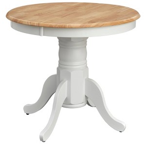 The Hawthorne Round Dining Table from Buylateral is sure to enhance your dining space with charm. The round modern farmhouse design creates a cozy interactive space for family and guests to gather. With its two-tone natural and white finish, and 40 inch diameter, this table is an ideal fit for smaller spaces. Constructed of environmentally friendly solid rubberwood, it features a turned footed pedestal base for added interest.