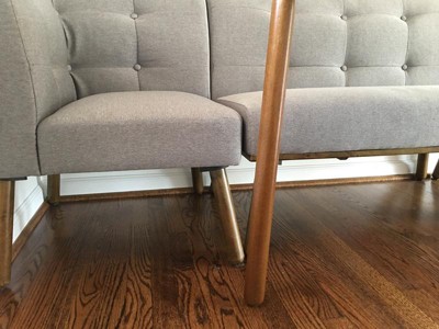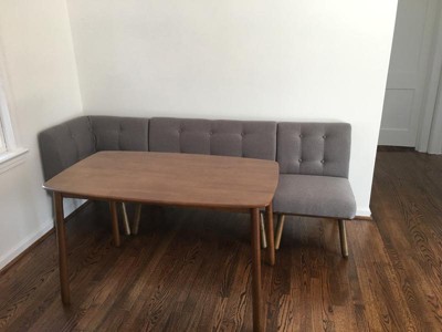 Was so excited to find this set, it’s a perfect fit for my dining area. I absolutely love the color of the fabric and the concept. The set was easy to construct and feels sturdy. The seats are firm and comfortable. Unfortunately, the quality just isn’t there. For starters, the table and the legs of the chairs are COMPLETELY different colors. The table is a rich warm color and the legs of the chairs have an ashy cast. Kind of defeats the purpose of a dining set. Secondly, the loveseat and chair are constructed differently from the corner chair causing a noticeable difference in height. 2 of the chairs include a wood bottom that the legs attach to and the corner seat the legs attach directly to the chair. The wood is visible so it really stands out that one doesn’t have it. Lastly, the table is disproportionately small in comparison to the bench. The table is only about the length of the love seat. Super disappointing. Thankful I purchased this on sale, but even that seems overpriced for a mismatched ‘dining set’.