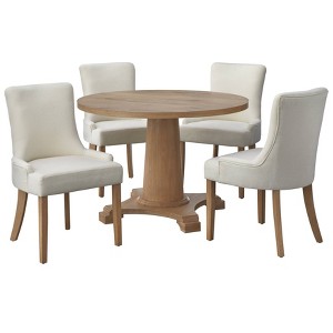 A brilliant addition to any dining room, the 5-piece Anneli Dining Set features a bold pedestal table and 4 upholstered chairs, creating an inviting setting to gather around. Perfect for transitional or modern farmhouse interiors, the table is crafted of sturdy rubberwood and a veneered MDF tabletop in a light oak finish. The 4 high-back chairs are designed with low, sloped arms and subtle back curves, creating a welcoming demeanor that invites you to comfort at every meal. Cushioned, cream-color fabric mimics the smooth softness of linen. Chair legs are made of solid rubberwood in weathered light oak finish.
