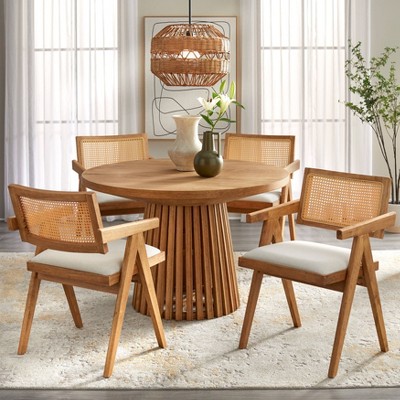The Morena Dining Table makes a statement in your dining room with its distinctive base and Mid-Century Modern inspired demeanor. The pedestal base features a lath-style design, giving the table a unique visual interest. The base widens at the bottom for added stability. Crafted from a mix of veneered MDF and solid wood, this table provides a sturdy foundation for every meal while also elevating the look of your dining room. Seats up to 4 (chairs sold separately). Finished in light walnut.
