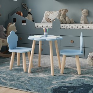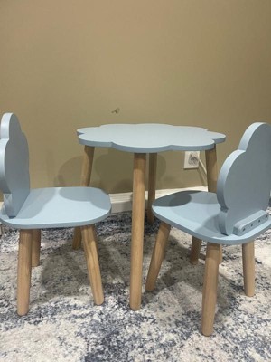 [This review was collected as part of a promotion.] Kids 3-Piece Wooden Cloud-Shaped Table and Chairs Set in Blue features a playful and imaginative design, ideal for children's rooms or play areas. The set includes a cloud-shaped table accompanied by two matching chairs, all crafted from durable wood. - Design: Cloud shape adds a whimsical touch, encouraging creativity. - Material: Made of high-quality wood, ensuring stability and longevity. - Color: A soothing blue and natural wood finish, complementing various decor styles. - Functionality: Suitable for arts and crafts, games, or reading activities, promoting a dedicated space for children. - Safety: Edges are rounded, minimizing the risk of injury during play.