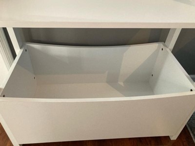 [This review was collected as part of a promotion.] This bookshelf with storage bin was a fairly easy build, but the cam locks took a bit of turning to line up when building the bottom bin. The bottom bin was deep enough to hold multiple blankets or stuffed animals. I liked that each shelf had a raised edge in the back so items could not fall off the back if you pushed them too far. The stickers to cover the screws and can locks were a nice addition but still were fairly noticeable. Overall, I like how large the shelf is and that it seemed sturdy enough to hold some weight.