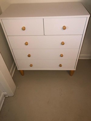 This drawer was really cute in the photos but not easy to put together. We followed the instructions but it didn’t come together like the picture. The drawers are very shallow and barely hold any clothes at all. Only one drawer can be opened at a time and it was hard for my 5yo to use since each drawer has to be closed just right in order to open another one.