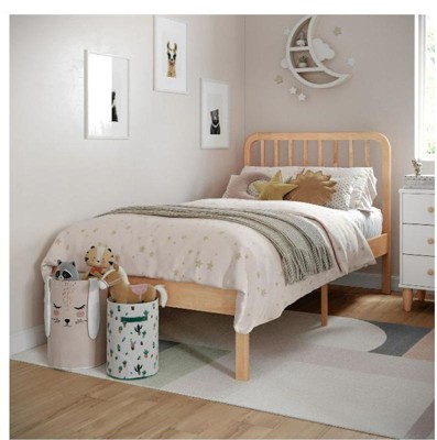 Turn your child’s bedroom into a sanctuary of sweet dreams with this solid wood platform twin bed. Designed with a gently rounded rectangular headboard and adorned with wood slat accents, this twin-size bed lends a clean and cozy look that will mesh seamlessly with your design scheme and décor choices. A wood slat foundation and wooden legs make this bed frame as durable as it is enchanting. Plus, no box spring is needed, making it easy to pair this eye-catching bed frame with your child’s existing mattress which is beneficial to any budget. Approximately ten inches of underbed clearance allow for ample storage space, perfect for storing toys or books to ease the transition from playtime to nap or bedtime. Guided assembly and all necessary tools are included for your convenience. Upkeep is just as simple by using a dry cloth to wipe clean. Available in appealing color schemes and with two size options available, finding the perfect style for your child’s room is effortless. Every evening will be an opportunity for your child to retreat to their special place, created just for them, to enjoy a restful night of sleep with this simply stylish and exceptionally durable solid wood platform twin size bed.