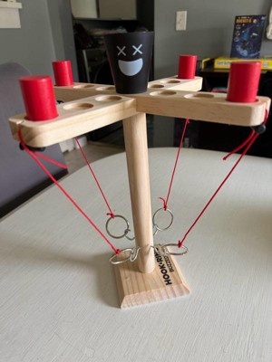[This review was collected as part of a promotion.] The Buzzed Hook & Ring 4-Way is a game I've played a similar version of and enjoyed, so I was happy to have a tabletop version of it! It's very easy to build and tear down, and provides a lot of fun. The strings that the ring hang on are slightly long and can be adjusted, but it does leave a bit of string kind of dangling. I suppose it could be cut to be adjusted slightly. It doesn't really prohibit the fun had while playing though! This version also includes a bit of a 21+ twist, but can also be removed to play for fun with family of all ages.