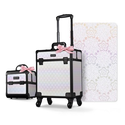 Features:- 2-Piece Makeup Case Set - Byootique Kit includes 1 pcs rolling makeup case and 1 pcs handheld train case. Inspired by Rococo aesthetics, this set features embossed lush blossom and scrolls, meeting your needs for cosmetics storage while inspiring you to explore full potential of beauty- Makeup Storage Solution - Rolling Makeup Train Case boasts 4 extendable trays on the top, open to display all your delicate cosmetics from lipsticks, eye palettes to nail polishes, and a spacious space underneath for extra storage of setting spray, hair stylers, hair dryers, and bottles- Cosmetology Case on Wheels - 360-degree rotating, detachable wheels offer superior maneuverability and quiet transport. Navigate bustling backstage areas and crowded airports with graceful ease. Simply press the buttons and detach the wheels for compact storage and replacement- Portable Cube Case with Mirror - Cube-shaped Makeup Case unfolds to reveal 2 expandable tiers that keep liners, palettes, lipsticks, and jewelry neatly separated. The built-in mirror helps you touch up your look or apply makeup directly from the case, ideal for on-site makeup services where a vanity is unavailable- Lockable & Reinforced Train Case - These robust, securely latched cases safeguard your valuable tools and cosmetics, providing peace of mind wherever you go. Its durable construction ensures years of reliable use, standing up to the rigors of professional lifeSpecifications:- Rolling Case Dimension(LxWxH)(with Wheels) 13 3/4" x 9 13/16" x 19 1/2"- Train Case Dimension(LxWxH) 7 5/16" x 7 5/16" x 9 7/16"- Total Net Weight 10.9 LbsPackage Contents:- 1x Rolling Case- 1x Train Case- 4x Wheels- 4x Keys- 2x Silk Scarfs- 2x Manuals- Package Content:- 1x Rolling Case