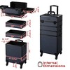 Features:- 4-in-1 Customizable Structure - 4 sections allow free combination, can be combined into 1 large train case or used as a 2 to 4-layered trolley; The 2nd and 3rd sections for providing 2-layer space to store lipsticks, mascaras, etc.- Easy Access - Top section with 4 extendable trays for organizing small and delicate cosmetics such as brushes and pencils, jewelry or accessories in an orderly fashion, allowing convenient retrieval of cosmetics without rummaging through other items in the case- Removable Spinner Wheel - Equipped with 4pcs 360-degree swivel wheels for smooth movement in every direction for convenient transportation while traveling- Sturdy Construction - Made up of a sturdy ABS body with strong aluminum frame and reinforced corners for maximum durability and protection, while its 8 lockable latches and keys ensure the security of your cosmetics and your peace of mind while travelingSpecifications:- Overall Dimension with Wheels(LxWxH) 14 9/16" x 11 7/16" x 32 1/16" (37 x 29 x 81.5 cm)- Top Case Dimension(LxWxH) 13 3/8" x 9 7/16" x 3 3/8" (34 x 24 x 8.5 cm)- Middle Section Inner Dimension(LxWxH) 13" x 9 1/4" x 2 13/16" (33 x 23.5 x 7.1 cm)- Bottom Section Inner Dimension(LxWxH) 12 13/16" x 8 11/16" x 14" (32.5 x 22 x 35.5 cm)- Weight Capacity 54 Lbs (24.5 kg)- Material Aluminum Frame- Net Weight 13.7 Lbs (6.2 kg)Package Contents:- 1x Makeup Train Case- 4x Wheels- 4x Keys- 1x Silk Scarf- 1x Manual