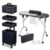Features:- Nail Table- Professional Nail Desk - Foldable Manicure Nail Table features built-in dust collector & wrist cushion, 4 pcs 360-degree swivel wheels with locks for easily moving to any places & locking to keep in fixed position; Ideal for nail art, beauty salon, Spa, professional manicurists, beauty gurus- Efficient Dust Removal - Built-in dust collector with powerful fan, one-click to remove nail clippings and dust and collect them into the dust bag, no more dust flying- Comfortable Cushion - Comes with soft sponge-filled wrist cushion for providing support to client's arm comfortably, helping relieve soreness- Train Case- Different color designs - 4 in 1 makeup case with different color options, suitable for beginners to professional makeup artists; includes a detachable top box that can be used as a separate carrying case- 4-in-1 Customizable Structure - 4 sections allow free combination, can be combined into 1 large train case or used as a 2 to 4-layered trolley; The 2nd and 3rd sections for providing 2-layer space to store lipsticks, mascaras, palettes, etc.- Easy access - 4 retractable trays on the top for organizing small and delicate cosmetics such as brushes and pencils, jewelry or accessories, and easy access to cosmeticsSpecifications:- Nail Table- Overall Dimension(LxWxH) 35 7/16" x 17 5/16" x 28 7/16"- Dust Collector Voltage 110 to 120 V- Net Weight 21.2 Lbs- Train Case- Overall Dimension with Wheels(LxWxH) 14 9/16" x 11 7/16" x 32 1/16"- Weight Capacity 54 Lbs- Net Weight 13.7 LbsPackage Contents:- 1x Makeup Train Case- 4x Wheels- 4x Keys- 1x Manicure Table- 1x Wrist Cushion- 1x Carrying Bag- 3x Dust Bags- 2x Manuals- Package Content:
