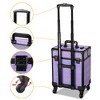 - Rolling Makeup Train Case boasts iridescent purple shade with forget-me-not flower, conveying a sense of mystery