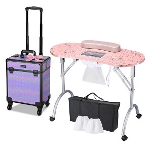 Features:- Nail Table- Professional Nail Desk - Foldable Manicure Nail Table features built-in dust collector & wrist cushion, 4 pcs 360-degree swivel wheels with locks for easily moving to any places & locking to keep in fixed position; Ideal for nail art, beauty salon, Spa, professional manicurists, beauty gurus- Efficient Dust Removal - Built-in dust collector with a strong fan, one button to clean away nail crumbs & dust and collect into the dust bag, no more dust flying- Comfortable Cushion - Comes with soft sponge-filled wrist cushion for providing support to client's arm comfortably, helping relieve soreness- Train Case- Charm ForgetMeNot - Byootique Rolling Makeup Train Case boasts its iridescent purple shade with forget-me-not flower design, a charming symbol of enduring love, devotion and loyalty- Large Capacity - Features 4 extendable trays on the top layer, open to display all your trending collection of cosmetic or nail polishes, along with 12" x 8" x 12" large storage space on the bottom for large bottles, hair dryers, hair sprays and more- Sturdy Construction - Made of rustproof aluminum frame with reinforced metal corners for a longer lifespan and stable structure, this makeup case boasts premium sturdiness with a load capacity of up to 44 Lbs, ensuring your door-to-door service hassle freeSpecifications:- Nail Table- Overall Dimension(LxWxH) 35 7/16" x 17 5/16" x 28 7/16"- Load Capacity 66 Lbs- Net Weight 21.2 Lbs- Train Case- Overall Dimension(LxWxH)(with Wheels) 13 3/4" x 9 13/16" x 19 1/2"- Weight Capacity 44 Lbs- Net Weight 8.4 LbsPackage Contents:- 1x Makeup Case- 4x Wheels- 2x Keys- 1x Manicure Table- 1x Wrist Cushion- 1x Carrying Bag- 3x Dust Bags- 2x Manuals