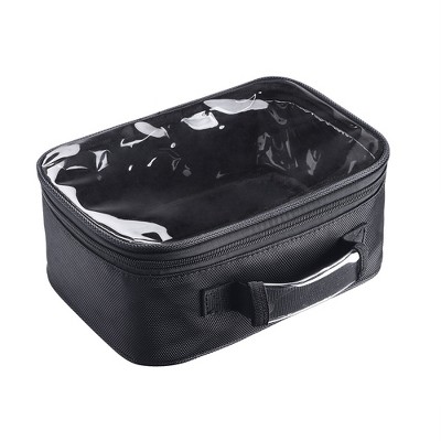 Features:- Travel-friendly - Byootique Makeup Travel Toiletry Bag features a lightweight design, easy to store and organize your cosmetics, travel items, toiletries and tools, allowing for easy access and keeping your items at hand during travel- Transparent Cover - Features a transparent cover for clear visibility and easy identification of your items without opening the bag- Durable & Water-Resistant - Made of a 420D nylon exterior for wear-resistance, while featuring a water-repellent vinyl interior to prevent leakages of liquids and lotions, great for use in the toilet or bathroom while traveling- Portable - Comes with a handle with clear cover for easy carrying on travel and displaying your dedicated labels or name cards for easy identification in large events- Wide Application - Suitable for makeup artists and beauty lovers to use for weddings, parties, shows, travels, tripsS Specifications:- Overall Dimension(LxWxH): 7 1/16" x 5 11/16" x 3 15/16" (18 x 14.5 x 10 cm)- Material: 420D Nylon, Vinyl- Max Capacity: 17.6 Lbs (8 kg)- Net Weight: 0.33 Lb (0.15 kg)