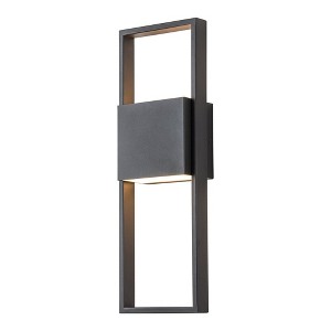 This outdoor wall light illuminates your porch or deck with a playful, modern aesthetic. Crafted from metal, it showcases a matte black finish that's weather-resistant, so it stands up to the elements. This light features an open, rectangular frame and a rectangular sconce with frosted glass that artfully diffuses the uplight and downlight. Integrated with energy-saving LED module and delivers 2000 Lumens of illumination. This outdoor light is rated for wet locations, making it the right lighting fixture to live outdoors and indoors.
