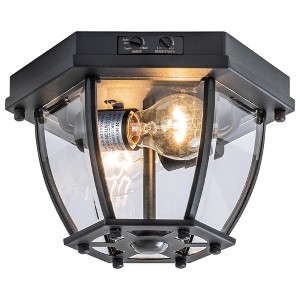 The traditional style outdoor flush mount is designed to bring decorative, functional illumination to your homes' porches, covered deck spaces, and outdoor utility closets. Featuring a rounded metal frame, an open bottom, and clear glass windows on all six sides, the fixture in matte black finish is weather resistant. Built-in a motion sensor on the bottom, a handy security feature around garages and patios, the motion detector has a 360 degree, 30 foot range. The sensitivity of the motion sensor and lighting timer is adjustable.