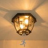 - Traditional design: featuring an attractive matte black metal square casing with curved clear glass panels, the flush mount will add a traditional style, security and safety to front porch and patio areas.It is damp location rated for covered locations such as porches or covered patios, garages, hallways, etc.
