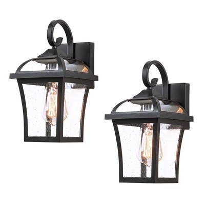 Elevate your outdoor living space with this elegant Black Outdoor Wall Lantern. Crafted with a sleek matte-black metal frame and accented by warm gold detailing, this lantern brings a sophisticated, transitional flair to any home exterior. The tall, rectangular silhouette showcases panes of seeded glass, which softly diffuses light for a welcoming glow. Inside, the candelabra style (E12) sockets cradle your choice of decorative bulbs (not included), evoking the charm of classic candlelight with the reliability of modern fixtures. Perfect for flanking entryways, illuminating porches, or accenting garden walls, this versatile lantern combines durable weather-resistant construction with refined style that complements both traditional and contemporary architecture.