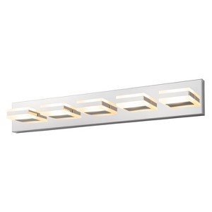 Brighten larger spaces with this stunning 5-light vanity fixture. Featuring a stainless steel frame and acrylic shades, this light is resistant to humidity and built to last. The chrome-finished design and layered geometric layout bring a sophisticated, modern touch, while integrated LED technology ensures efficient and warm illumination. Perfect for spacious bathrooms, vanity areas, or other large spaces, this fixture offers both style and practicality. Quick and simple to install, it¡¯s a great upgrade for your home.