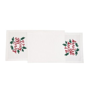 - This embroidered table runner features chain-stitched "Very Merry" lettering surrounded by festive sprigs of holiday greenery