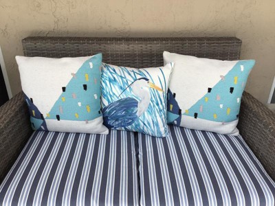I ordered seat cushions and pillows as replacements. The original seat cushions were a solid color ocean blueish shade. Unfortunately, they were lost during delivery & out of stock so could not be replaced. So I got blue striped cushions and was concerned about the pillows matching. I think it all worked out. I love this heron pillow!