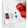 This embroidered waffle weave towel showcases three delectably refreshing popsicles, each adorned with its own unique patriotic flair. Against a crisp white backdrop, these treats exude a sense of summer joy. This towel is elegantly trimmed in a rich navy blue, adding a sophisticated touch to its delightful design. Liberty always tasted this sweet.