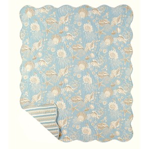 - Displaying ornate sandstone colored shells and diverse sea life on a soothing blue ground, this quilted table topper is the next best thing to oceanfront dining.