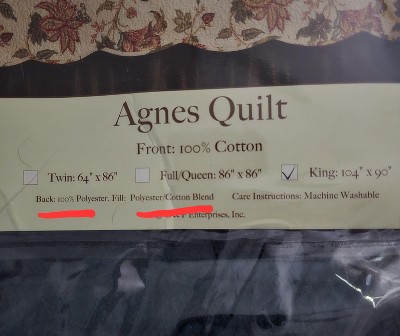 The item specifications on the Target site says everything is 100% cotton (fill, textile, and backing). The packaging itself says the back is 100% polyester and the fill is polyester/cotton blend. If you're looking for an all cotton quilt, this is not it. I'm glad I got this on sale and not for full price.