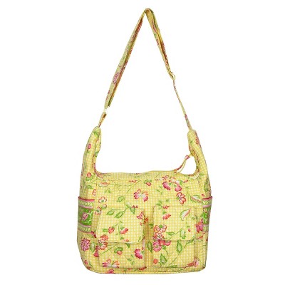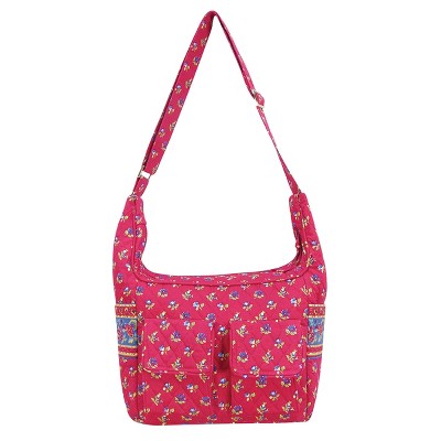 - Mearsures at 10" x 13" x 6" with an adjustable strap. Lined with 2 side pockets and a main zipper closure.