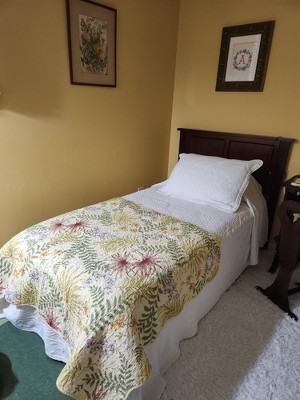 - This beautifully quilted throw features a botanical pattern with scalloped edges, adding a touch of elegance to any space. Its timeless design enhances the aesthetic of your living room, bedroom, or patio, creating a serene atmosphere in any setting.