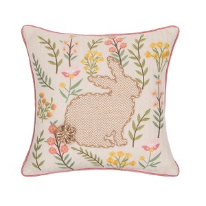 - Bring the joy of spring into your home with this bright Easter Bunny pillow, featuring a cheerful floral arrangement and soft pastel colors.