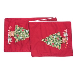 Light up your holidays with this fun, festive Holiday Tree embroidered table runner. Give your space the gift of holiday cheer with this unforgettable design, featuring a red background, a fully adorned Christmas tree with ornaments, presents underneath, and a star on top. Make this holiday season sparkle with you!