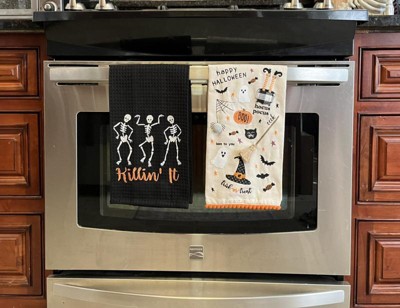Halloween is the best time of year to be "killin' it" in the kitchen. Whether your spooky treats are the life of the party or the afterlife of the costume parade, you'll be cooking and baking in style with these three sassy skeletons. Displaying embroidered skeletons and the message "Killin' It" on a black waffle weave towel. This kitchen towel is perfect for hostess gifts, housewarmings, teachers, or for anyone on your holiday list. Crafted of 100% cotton and machine washable. Towel measures: 18 inches x 27 inches.