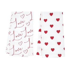 - One towel features the word "love" in flowing cursive script with scattered hearts, while the second shows a classic red heart pattern, giving the coordinated set visual contrast that feels romantic yet clean and suitable for both decorative display and regular kitchen tasks.