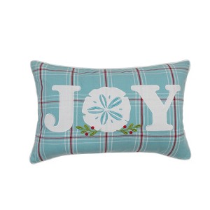 This 14" x 22" Plaid "JOY" pillow features an embroidered holly branch and sand dollar design, perfect for beach house and Christmas décor. A versatile accent piece for any living room, bedroom, or sofa, it also makes an ideal holiday gift.