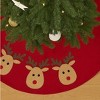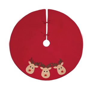 - Adorn your holiday setup with this festive red tree skirt featuring a charming trio of reindeer at play. The timeless Christmas motif adds warmth and joy beneath both faux and real pine trees for a picture-perfect seasonal display.
