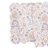 The Selma tabletop collection has a printed design of beautiful damask watercolor floral and dots in shades of blue, tan, gray, and gold. The scallop-edge table linens reverse to a gray textured abstract pattern. Available as a napkin, placemat, round placemat, and runner. Love this pattern? Selma is also available as a bedding collection.