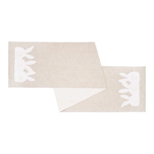 - Add a cheerful Easter accent to your kitchen, dining room, or tabletop with this 14" x 72" table runner featuring a trio of adorable white bunny rabbits with tufted bums for a touch of playful texture and seasonal charm during spring gatherings.