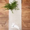 Featuring a neutral background with delicate white stripes, the White Bunny Hop Stripe woven table linen collection is adorned with a charming white leaping rabbit, complete with a delicate bow around its neck. Perfect for hosting elegant Easter celebrations, these linens add a touch of whimsy and sophistication to any table setting.