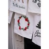 100% cotton flour sack dishtowel featuring a holiday wreath design, perfect for festive kitchen decor and everyday drying. Absorbent, soft, and machine washable for seasonal practicality and charm. A lovely Christmas gift or accent for winter gatherings.