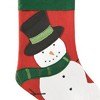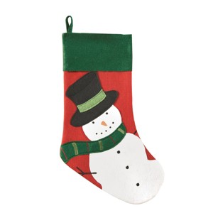 - Complete your Christmas holiday display with this hand crafted snowman applique stocking. Each stocking comes with a ready to hang fabric loop, the perfect finishing touch to your holiday display.