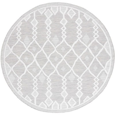 Elevate your living space with the understated elegance of our Ivory/Grey Indoor/Outdoor Area Rug. This beautifully designed round rug measures 6'-5" in diameter, making it a versatile fit for a variety of settings. Each rug is meticulously crafted using a Power Loomed construction technique, ensuring a durable and long-lasting floor piece.