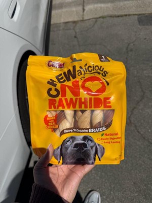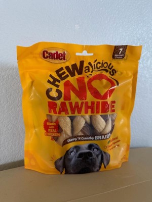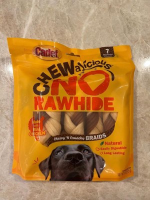 Cadet Chewalicious Chewy 'N Crunchy rawhide-free braids twist 2 unique textures for a blissfully delicious, easily digestible treat. Made with the finest natural ingredients, these long-lasting chews indulge your furry friend with the taste of real chicken—and no artificial flavors or preservatives. They even promote a healthy smile, helping clean teeth and gums as dogs chew.