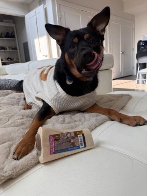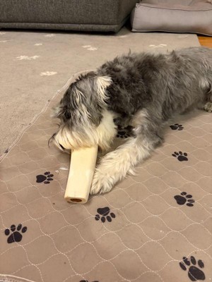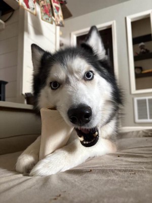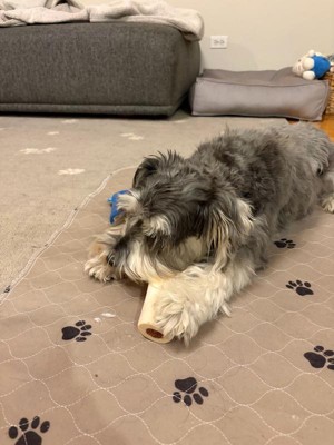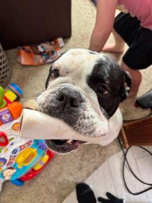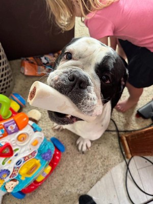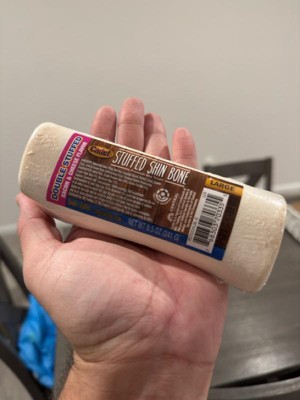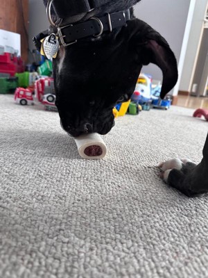 [This review was collected as part of a promotion.] My dog LOVED this shin bone and went crazy for it as soon as we began unwrapping it. It was sturdy and comfortable for him to hold, plus he loved the challenge of trying to get the filling out of the inside. Overall, it’s a great mess-free enrichment treat!
