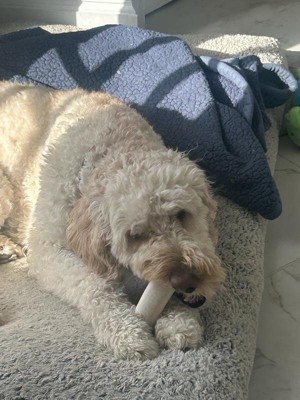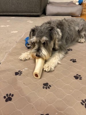 [This review was collected as part of a promotion.] This large stuffed bone is too big for my 18lb mini schnauzer so I gave it to a friend's 70lb bernedoodle. She enjoys it quite well. She loves the stuffing inside and chews on the outside every once in a while. It's not her favorite as she doesn't go for this all the time but it's definitely a nice treat.