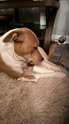[This review was collected as part of a promotion.] She stayed happily occupied and clearly loved this bone. Definitely a win! Not messy and great size. No odor and didn’t upset her stomach. Would definitely buy for her in the future.