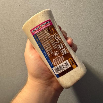 [This review was collected as part of a promotion.] My dog loves this bone. I can tell he will be chewing on this for hours. It will keep him busy. Only thing is the middle filling does make a small mess but it’s not a problem if he eats it on his bed. Overall he is very happy with it.
