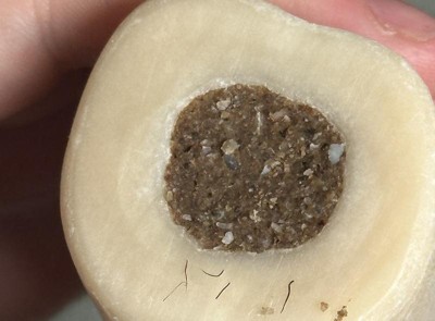 So… my dog likes it but I noticed these weird hairs in it? He only gets it when I’m there to hold it for him, and on one side that he didn’t lick, I found these thick black hairs embedded into it. I plucked them out with tweezers. My dog is white and definitely doesn’t have hair like this. It might be normal because it’s my first time getting this but I’m not sure