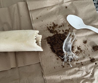 I noticed something white handing out the side of the bone as my dog ate the peanut butter. After digging it out, it ended up being a piece of plastic bag.