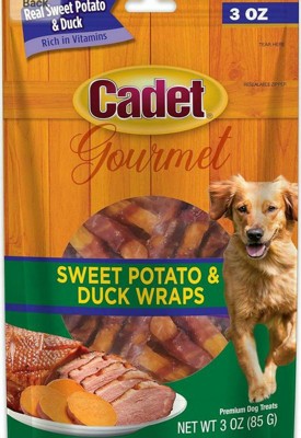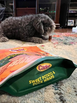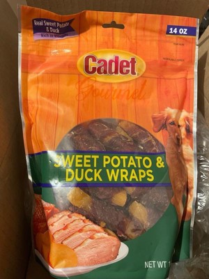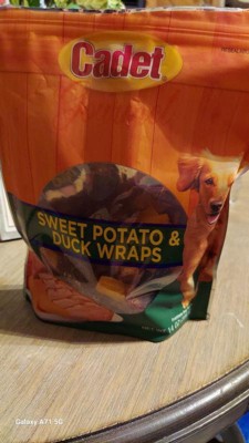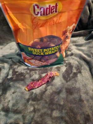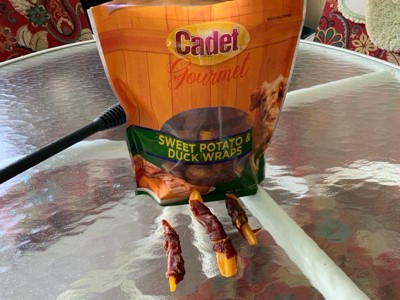 [This review was collected as part of a promotion.] My fur baby loves these Cadet Sweet Potato & Duck Wraps. He does his happy dance when he sees the bag. The Wraps are a appropriate size, but I do break them in half because they are a little hard for him to chew. I definitely would recommend them.