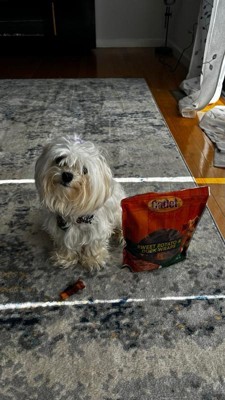 [This review was collected as part of a promotion.] My Maltese Dream absolutely loves this treat. I started her off by giving her the smaller pieces in the bag but she devoured it so quickly, that I am now giving her the larger ones as well. They have ingredients that I trust and that Dream really loves, especially the sweet potato which is in her kibble as well. Thank you for turning me on to this wonderful product.